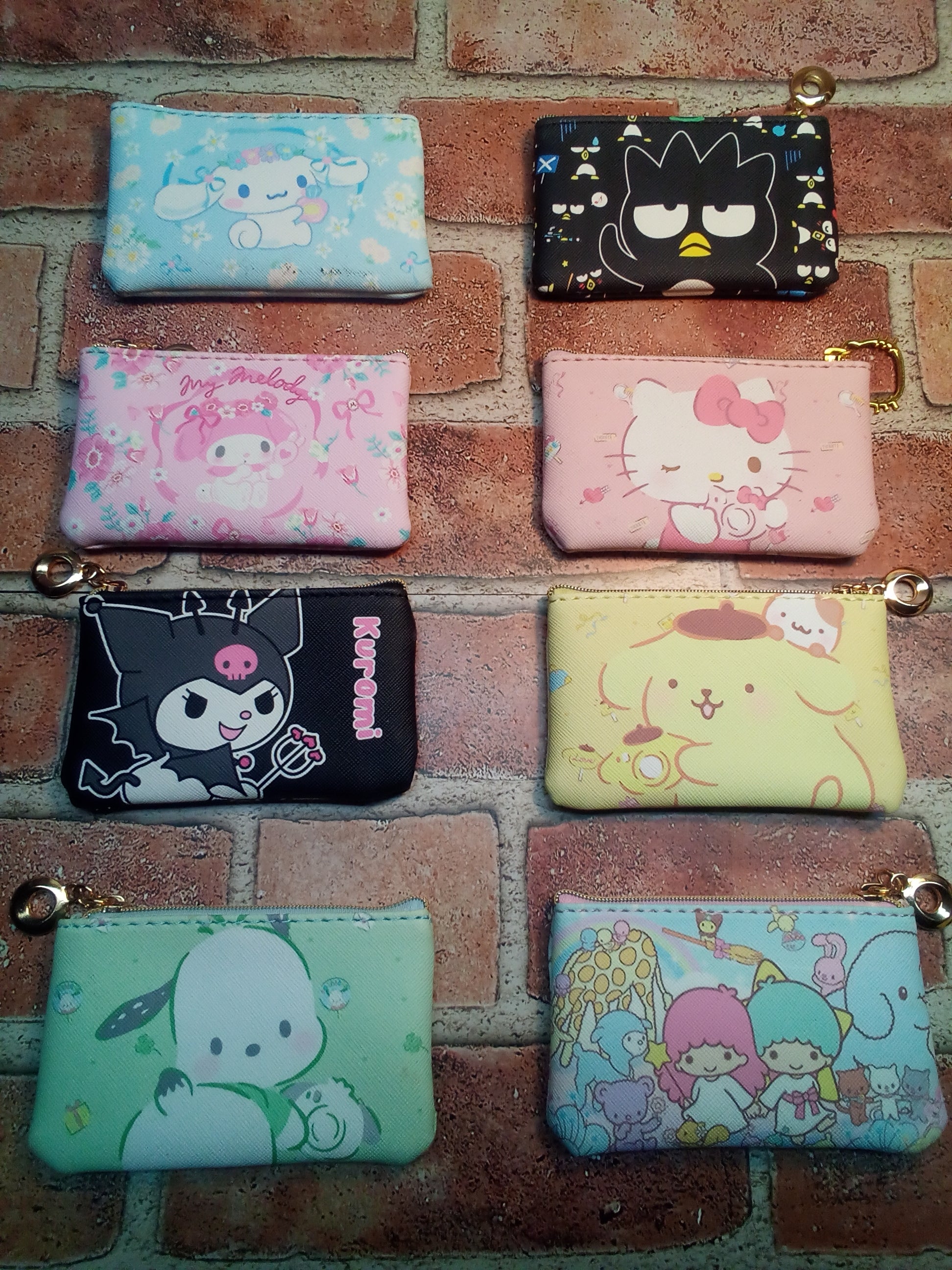 Hello Kitty and Friends coin purses. Easy to carry, small and discreet cute and fun pictures. Can be wiped off not cloth with a lining inside.